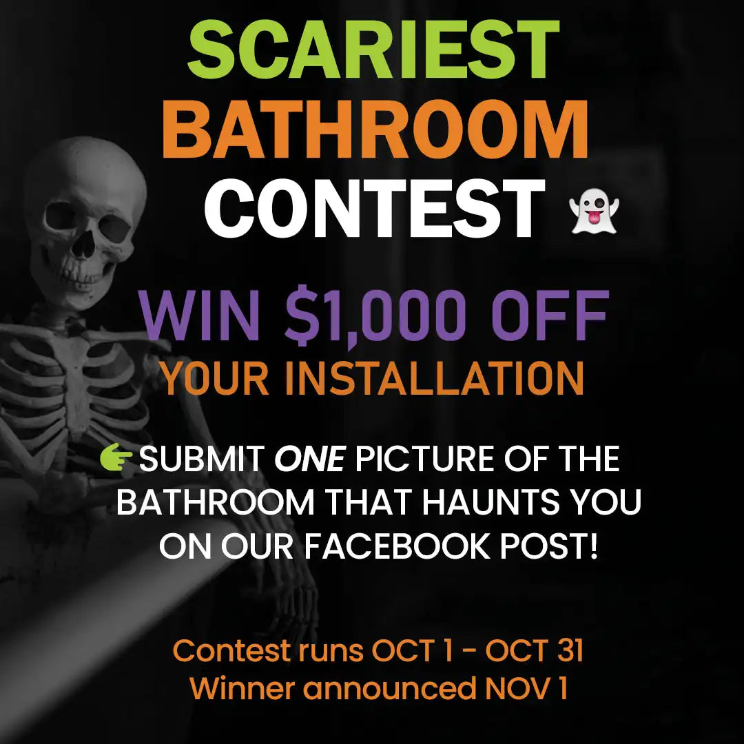Post one photo of the SCARIEST BATHROOM in your home in need of renovation, and qualify for a chance to win $1,000. OFF INSTALLATION!! Contest runs OCT 1 - OCT 31. Winner will be announced NOV 1.